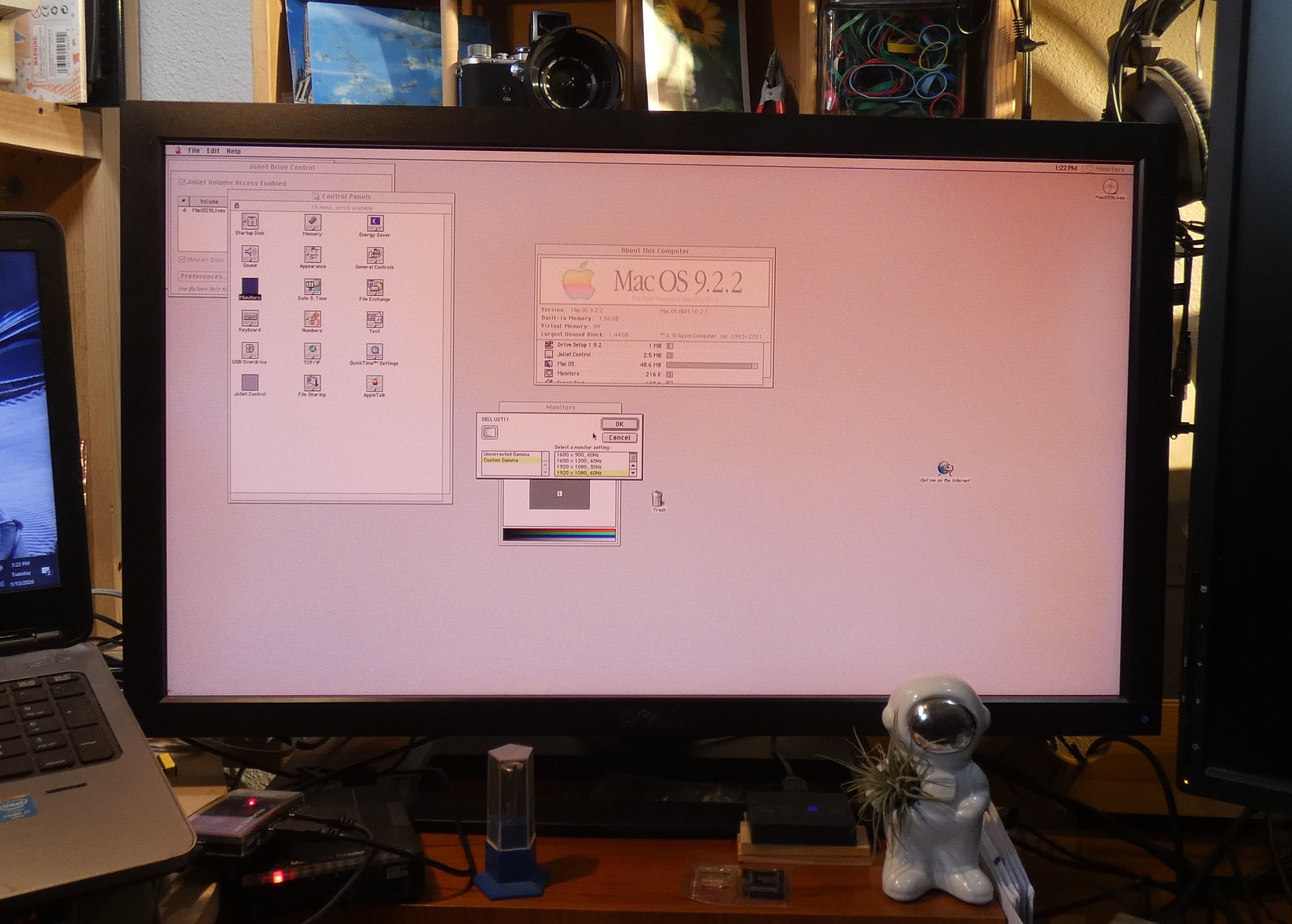Hooked up VGA to the old 4:5 panel and I get a signal there and eventually flashing question mark and finally it booted from the MacOS9Lives installer. Set that as the boot drive and I'm back to waiting interminably in front of a blank screed . . .