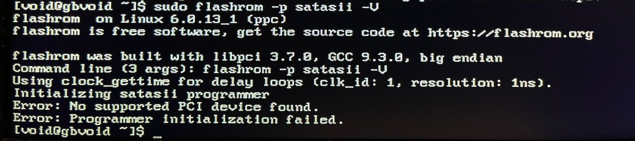 Could be a bug in the satasii flashrom driver in void. A different distro might help but it probably wont. I'll try and get Linux on my G5 and see if I can reproduce your trouble