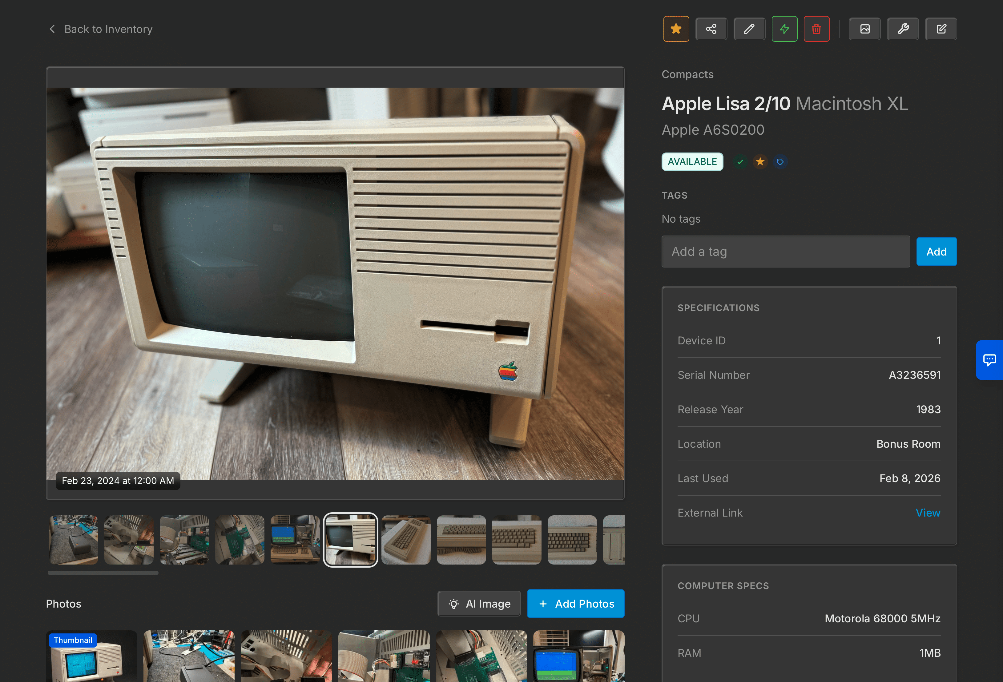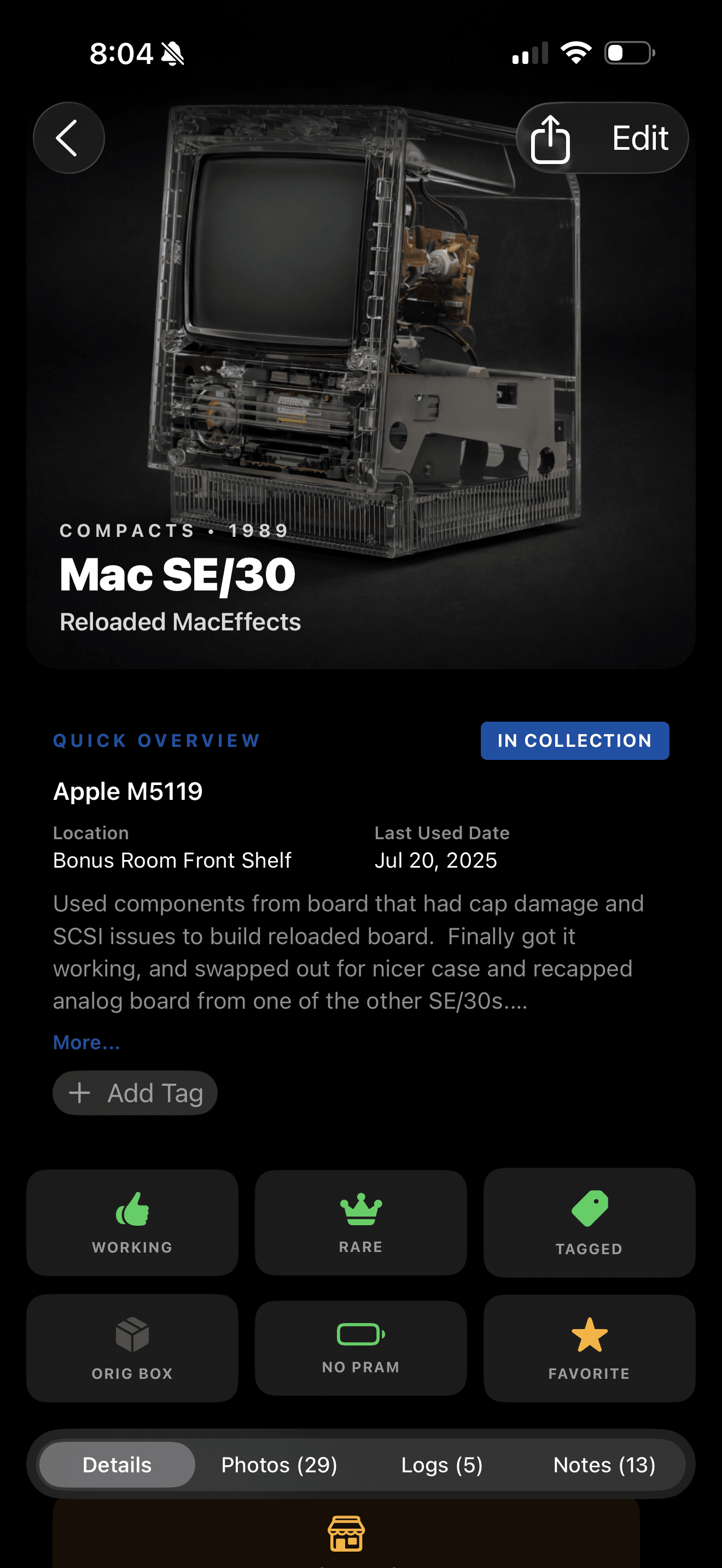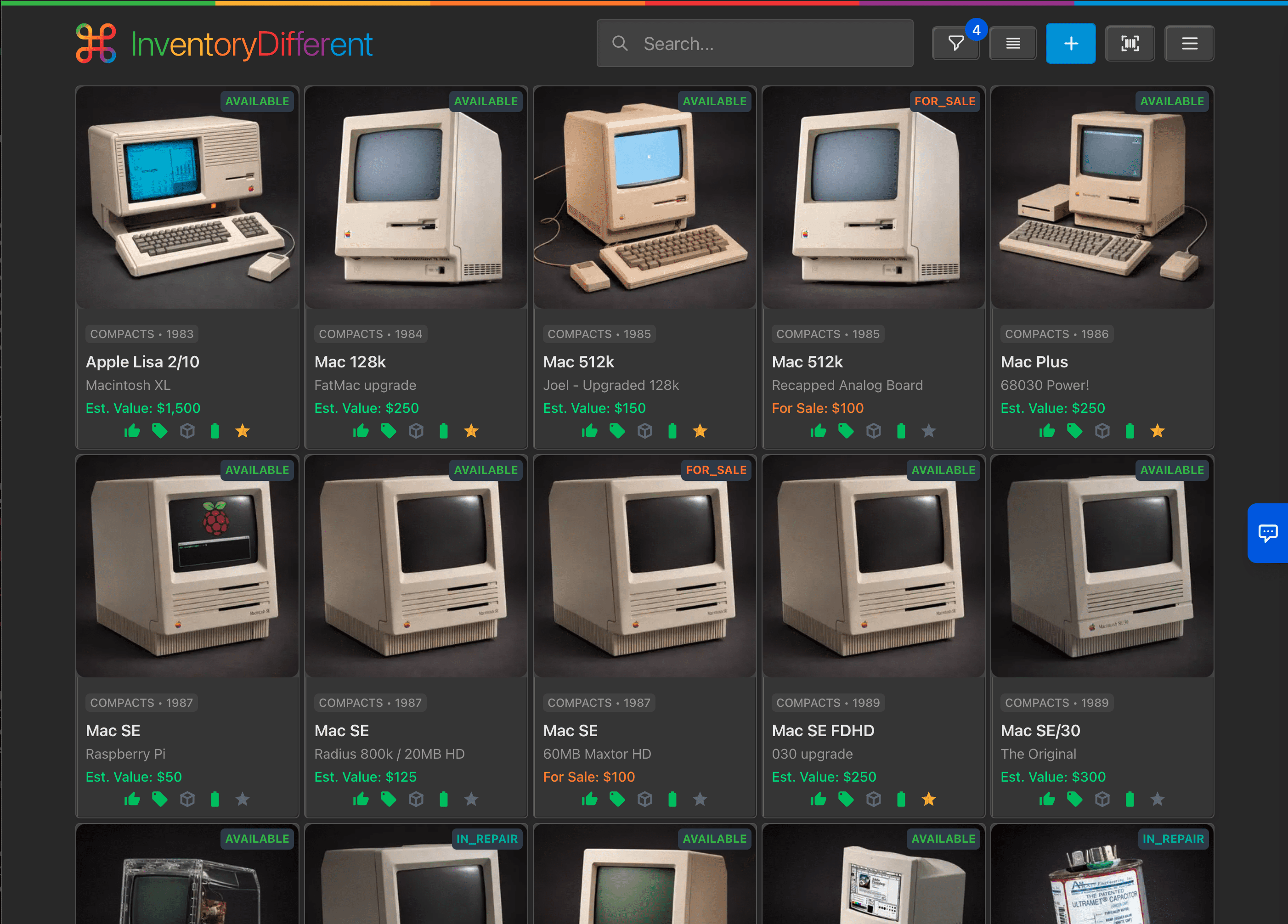 I've been collecting vintage Apple hardware for a few years now and kept running into the same problem: nothing out there really fits how collectors actually think about their stuff. Spreadsheets are clunky, generic inventory apps don't seem to capture the types of things I care about in my collection and don't streamline my workflow like I'd prefer, and most tools assume you're a business tracking assets, not someone who just wants to know where they put their Macintosh SE or whether they'd replaced the caps in it.