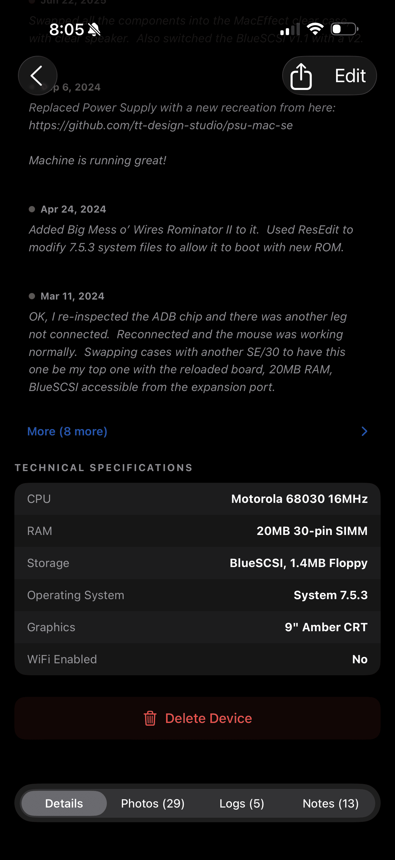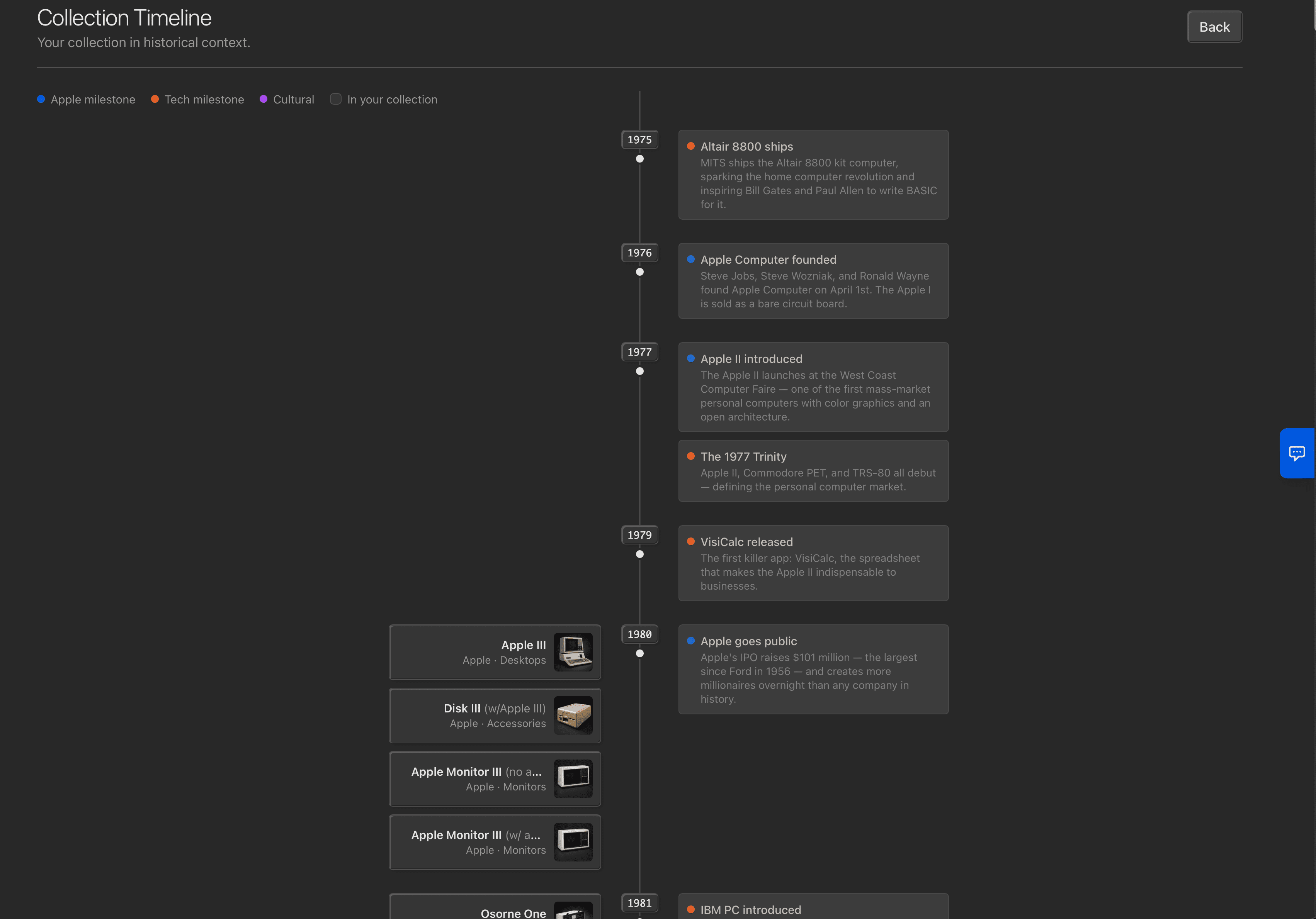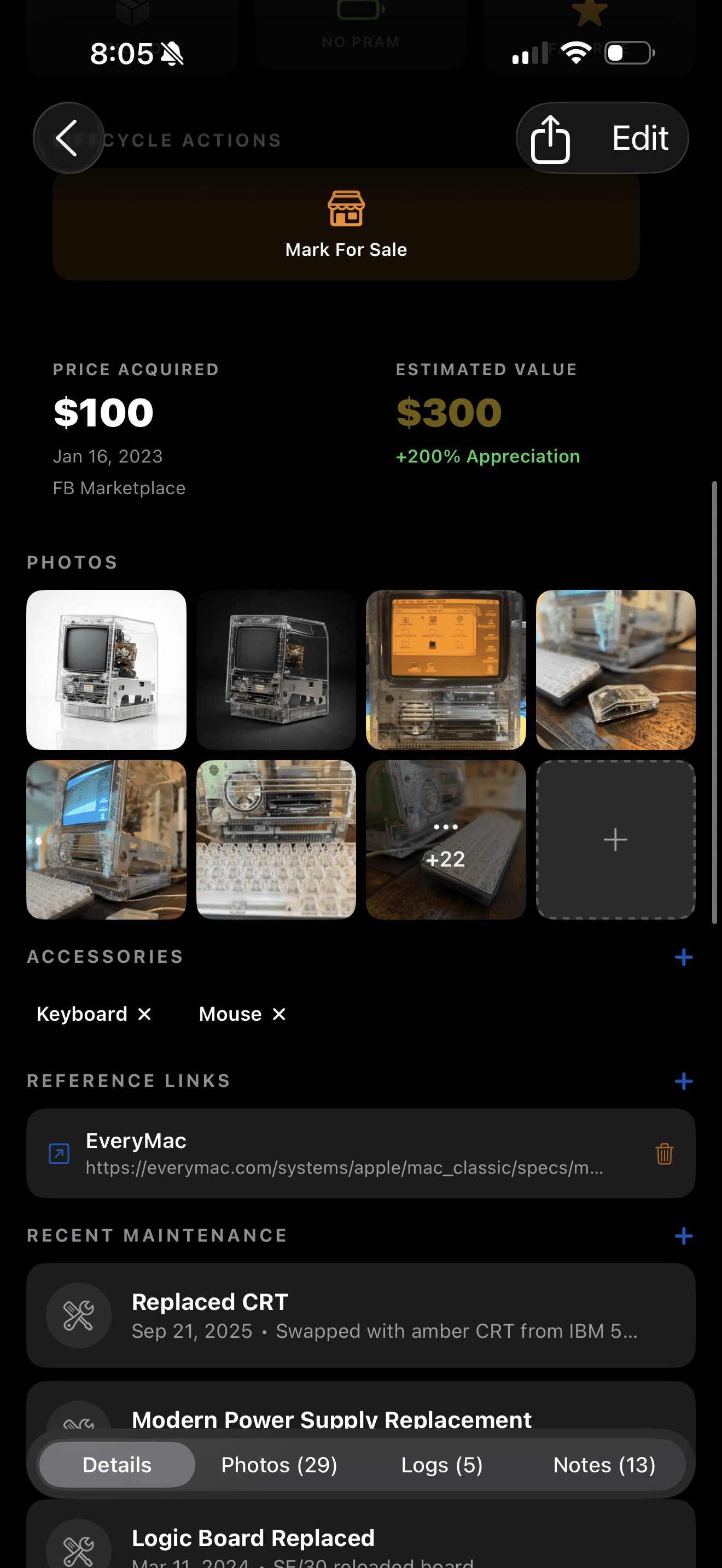 I've been collecting vintage Apple hardware for a few years now and kept running into the same problem: nothing out there really fits how collectors actually think about their stuff. Spreadsheets are clunky, generic inventory apps don't seem to capture the types of things I care about in my collection and don't streamline my workflow like I'd prefer, and most tools assume you're a business tracking assets, not someone who just wants to know where they put their Macintosh SE or whether they'd replaced the caps in it.