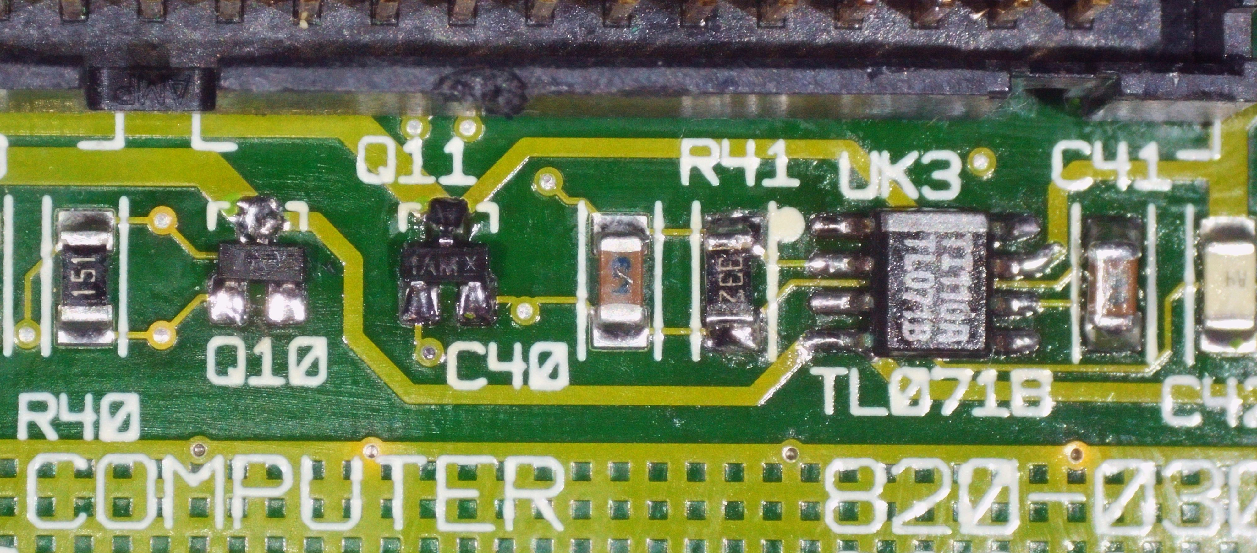 After spending time on Bravo's audio problems, I decided to check out Alpha's speaker problem while the subject was still fresh in my mind. Alpha was working perfectly after I restored it back in 2021, but I was using it as a known-good system for testing, and along the way, my sloppy probe work resulted in the speaker dying.To get things started, I verified the signal coming out of the Sony ICs and followed it to the bottom of the board. Everything was making sense up to the TL071B op amp at UK3. The signal was coming into pin 2, but the output from pin 6 was garbage. It was coming out a -8.8V and there was just the faintest hint of a signal. All the other pins looked normal, so it seemed something had gone amiss with the op amp.