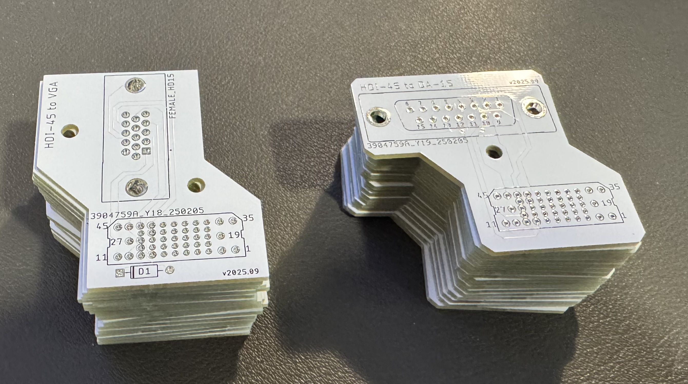 Yeah, it's actually coming back closer to my original idea of an adapter. Originally, I was trying to come up with a way to build a 2 PCB adapter (one with just the HDI-45 pins, then a bunch of wires connecting them to the HD-15 or DA-15 connector. That soldering job would have been a nightmare, considering the pin spacing on that HDI-45 connector.