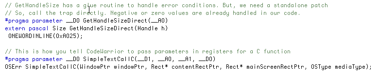 1. The system routine GetHandleSize has some glue code (they intercept the call in a local library before calling the system). I needed this call, but didn't want to add the weight of CodeWarrior's libary. So, I defined the direct call to GetHandleSize (I didn't need the glue fix).