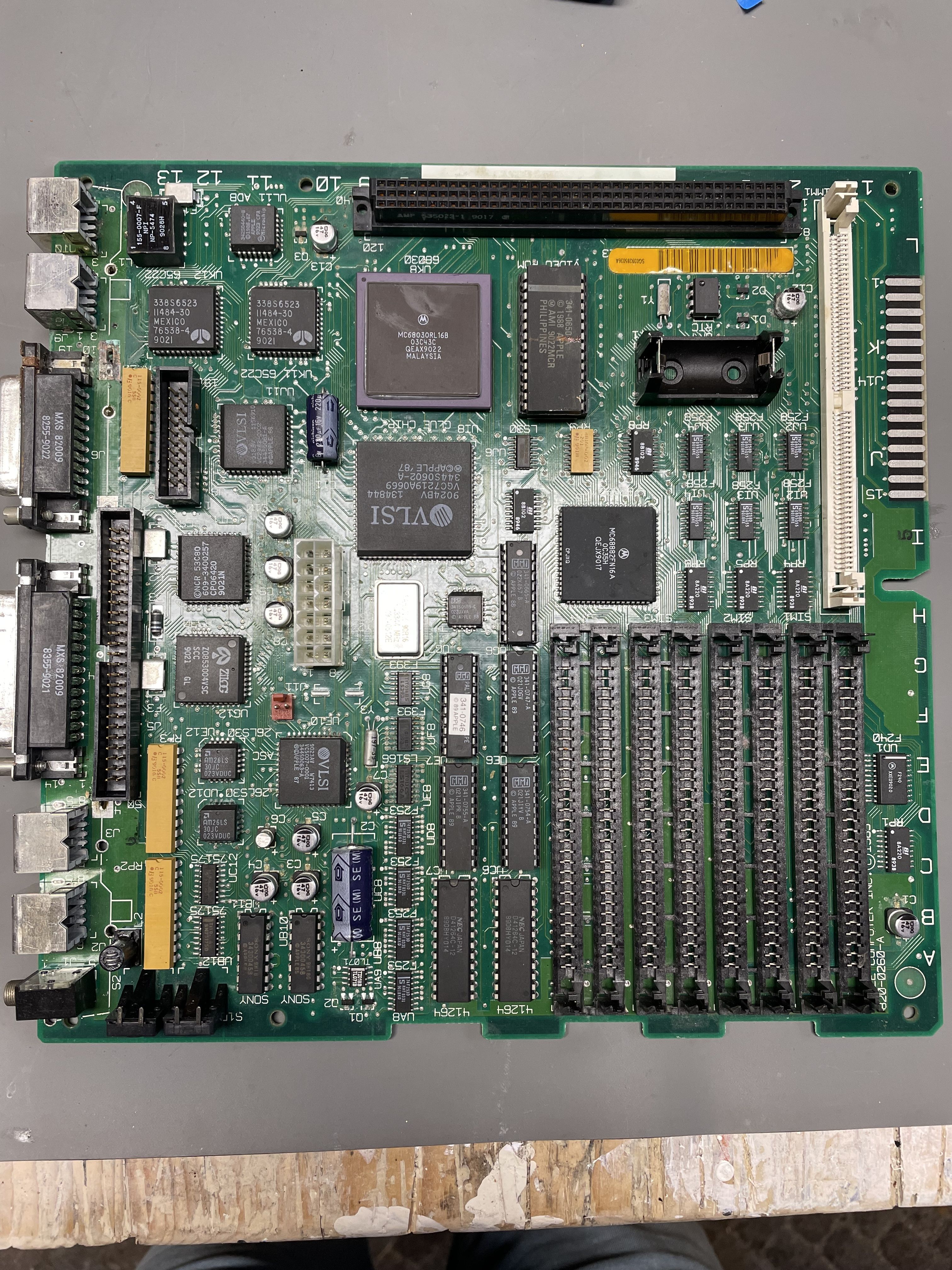 Hi All, Question, did a recap of the condensators, Power On -> have a boot sound but then dotted vertical lines. (was also before the recap) Had some battery leakage. But the Mac was stored for 20 years in a bag with display faced up. If you look at the logic board at UE8 and UF8 you see some corrosion. touched it with the iron but no effect.
