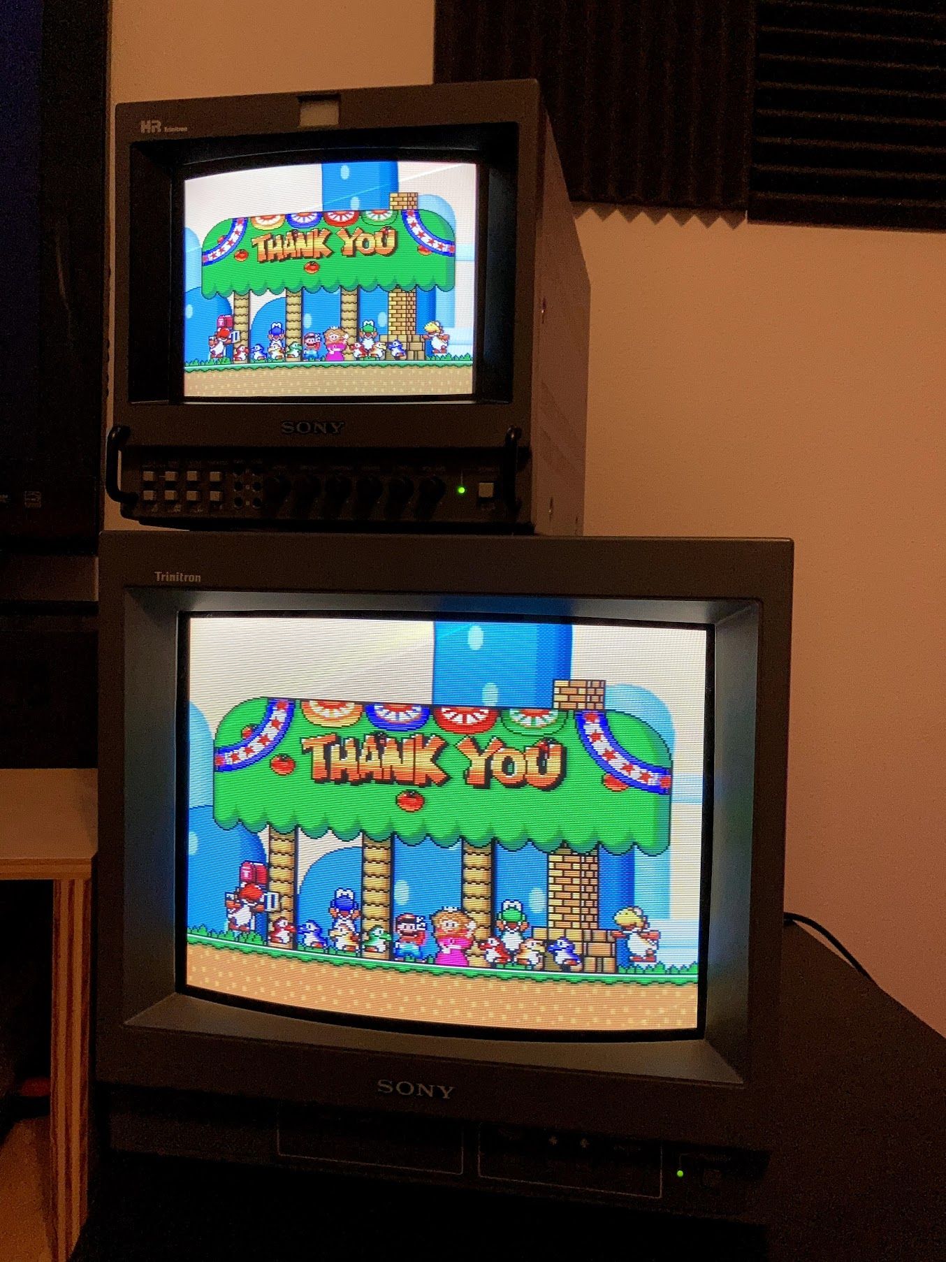 I have three sets with Trinitron displays! In my my main setup, I have a PVM-8045Q (8" PVM with 450 TV lines) and a PVM-14M2U (14" PVM with 600 TV lines). My video signals are a mix of S-Video and Component, going through an Extron switcher. Here, you can see my kids playing N64 and SNES.