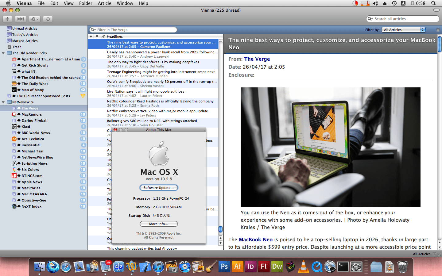 It's Vienna 3.0.8 Backported for Tiger. Vienna is a great open source RSS reader for Mac that includes syncing with RSS services like The Old Reader. For me, RSS is the superpower of the web that allows retro computers to "browse" the web in that they take websites stories and put them into a consistent and easy to render format. So I already had a great RSS reader that can sync with my Old Reader account for my iPhone 5 running iOS 6 called Reeder. Also on my 2017 Retina MacBook running Mojave, I also use Reeder. And on my modern Macs I use NetNewsWire again with The Old Reader sync.