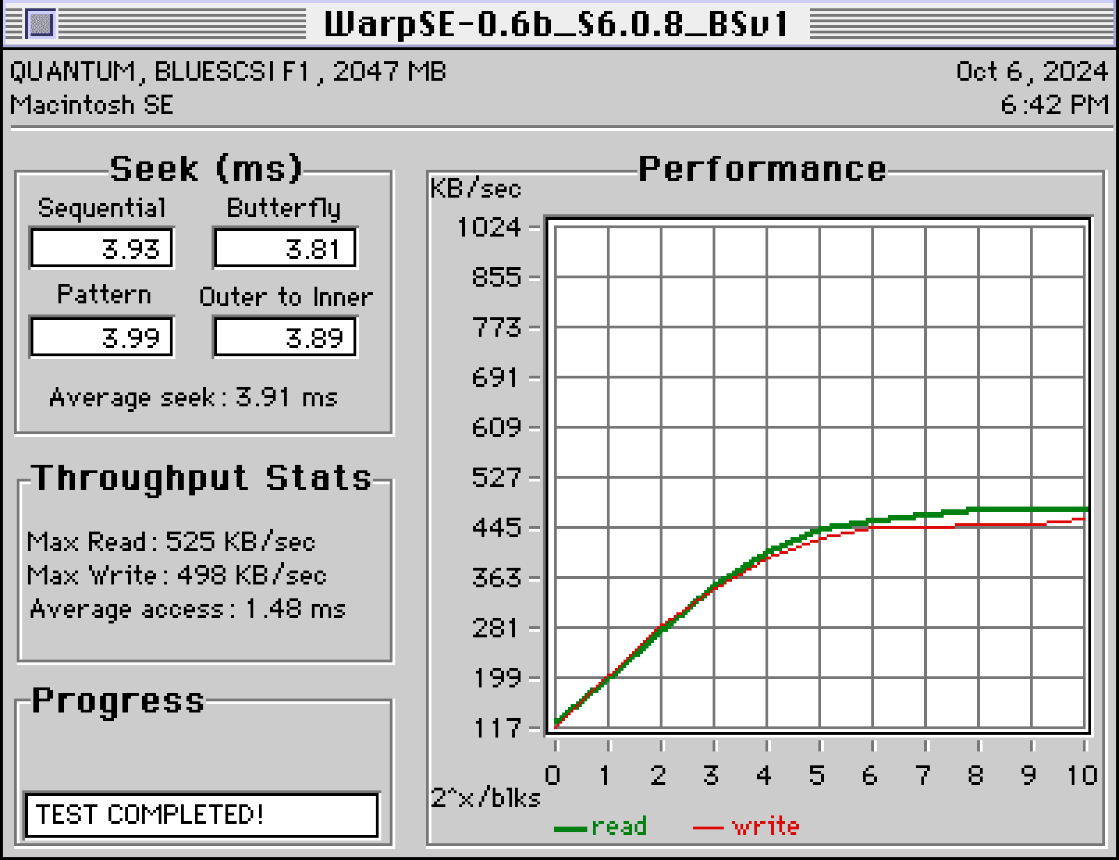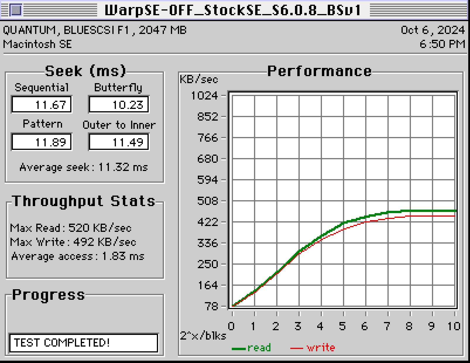SCSI performance is for the most part not enhanced by WarpSE when using 0.6b that I can see. To help show that I have prepared SCSI Director Pro 4.0 benchmark results showing that firmware 0.6b slows down SCSI to such an extent that WarpSE's SCSI performance matches the stock 8MHz SE (numbers below within margin of error):