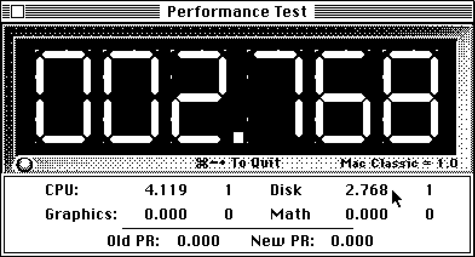 2.719 disk speed!! Great. And of course with the slightly faster clock on the final version, speed should be increased by another 4% or so! I am hoping to slightly exceed the SE/30's CPU score.
